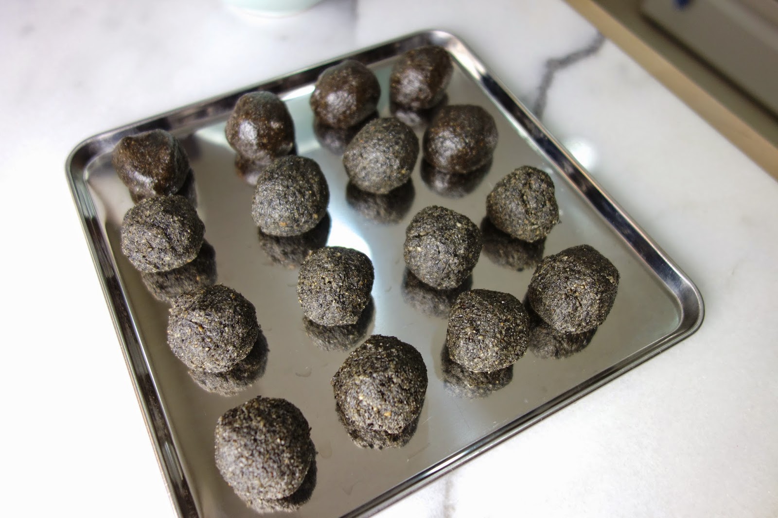 把材料放入調理機攪打,時間愈長餡料愈流動.只要增加調理機攪拌的時間,就可以變成芝麻抹醬了!將芝麻抹醬冷藏後,用小型冰淇淋挖勺,挖成一球一球,揉成圓形,之後再冷凍成為較硬的餡料,就可以拿來當作芝麻流沙湯圓的內餡了!