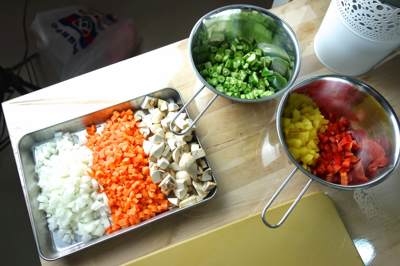 將所有蔬菜切小丁,雞肉用『BRINE』濃鹽水法醃漬過,切丁爆炒過!移出備用!